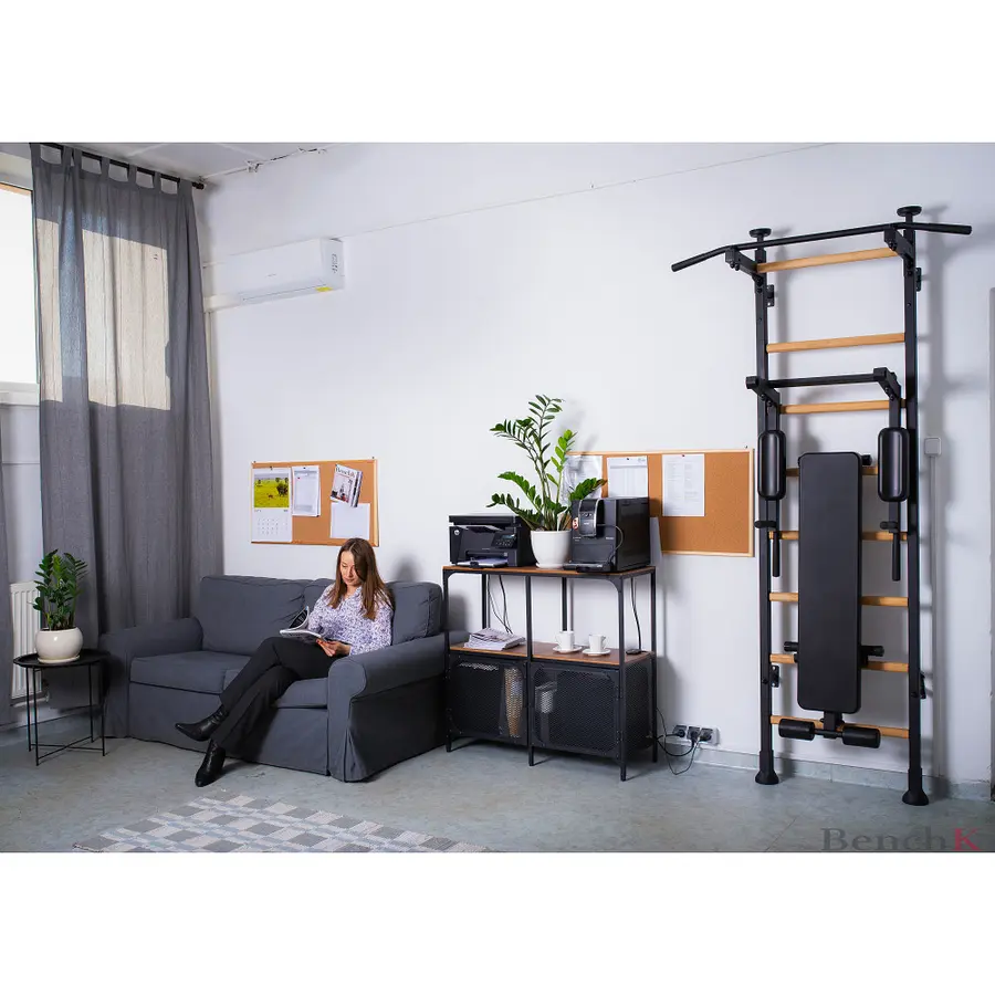 BenchK ribbevegg 513 med fastmontert pull-up stativ, dip bar og treningsbenk. Et multiapparat som muliggjør en variert treningsøkt. Dipsstativet har polstret armlener og monteres enkelt med 4 festekroker. Den kan festes på alle ribber slik at høyden vil passe brukeren. Pull-up stativet monteres øverst på ribbeveggen og den har et godt grep. Treningsbenken er vendbar med 2 roterbare kneputer. Ribbeveggen er laget av massivt bøketre og metall og den monteres enten til vegg eller fra gulv til tak. Ribbene er oljet med to lag økologisk linolje.