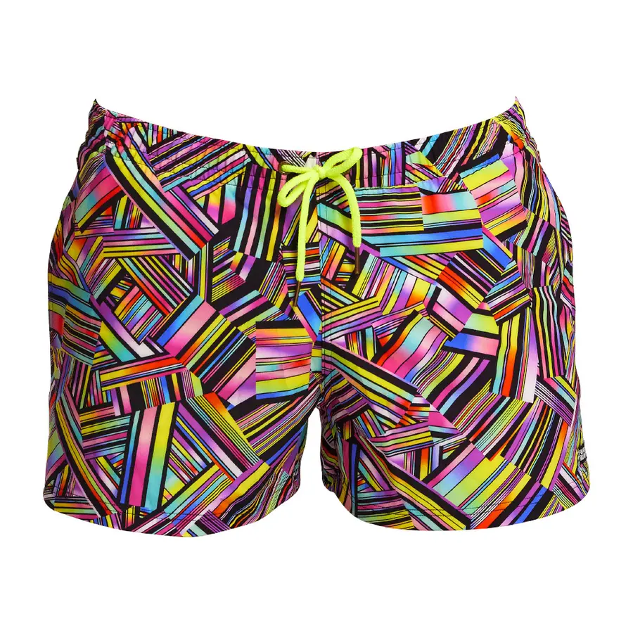 Strip Straps Shorty Shorts fra Funky Trunks. Shortsen har innertruse i mykt og luftig meshfor for ekstra sikkerhet, dype sidelommer, myntlomme og snøring i livet. En stilig fargerik badeshorts til basseng eller strandbruk, laget av hurtigtørkende polyester. Printet er i storformat slik at når det er plassert på produktet vil det kunne se annerledes ut enn på bildet, men det ser fortsatt bra ut.