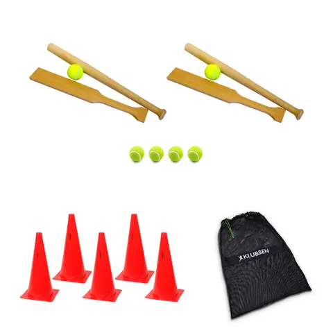 Slåball skolesett med flate og runde balltre i henholdsvis 50 og 60 cm. Skolesettet leveres med tennisballer.