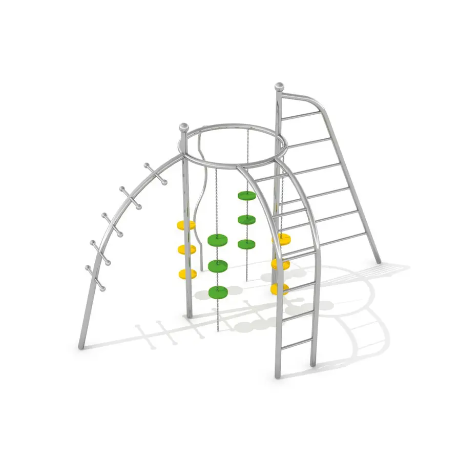 Klatrestativet Eskalo 1 passer til barn fra barneskolealder. Apparatet har livlige farger og både konstruksjonen og sklien er laget av rustfritt stål som tåler all slags værforhold og intensiv bruk. Stolpene er formet som følehorn på sneglen, så det ser ut som om sneglen har fått litt ekstra stil. Gulvet er laget av HPL med en tekstur som gjør det sklisikkert. Takket være denne løsningen er gulvet mykt, trygt og blir ikke varmt på solfylte dager eller kaldt om vinteren. Klatrestativet har tre stiger som er forbundet med én metallring med brannmannstang og fire elementer med fargede klatreringer.