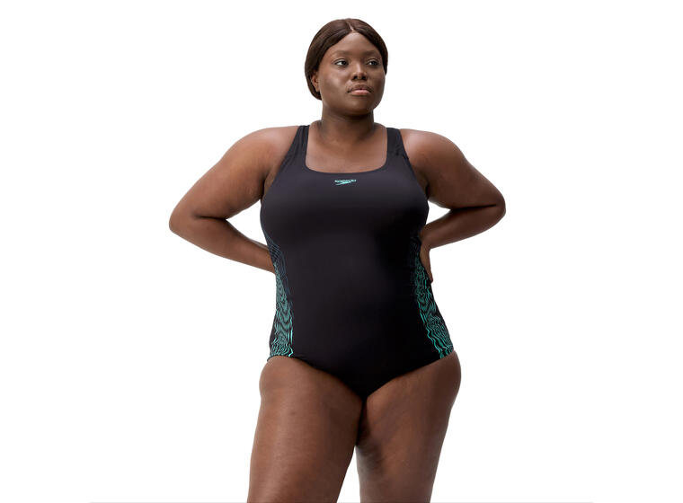 Speedo Placement Plus Size badedrakt med et sporty og flatterende design. Badedrakten har middels utringning og medium skjæring, samt Medalist design som gir gode skulderbevegelser og komfort under svømmetreningen. Den har lett byststøtte med et behagelig bånd under bysten som gir støtte. Drakten er laget for å være slitesterk og bedre for miljøet av ECO Endurance+ Max som er hurtigtørkende, klorresistent og laget av 100% resirkulert avfall.