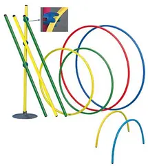 Det består av: • 3 ringer i hver utførelse (50, 60, 70, 80 cm) • 12 halve ringer • 24 turnstaver • 24 føtter • 24 stav- og ringholdere.